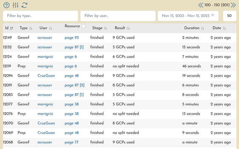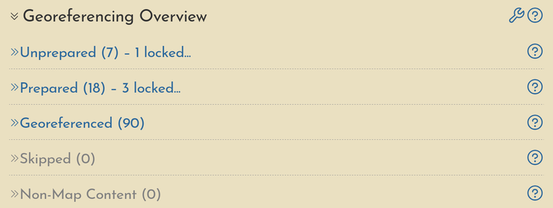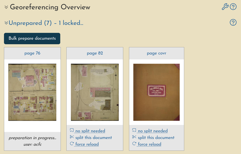 When a user begins working within one of the interfaces, whether splitting a document during the "preparation" step or creating ground control points during the "georeferencing" step, this action creates a lock on that resource, so no other users are able to affect the in-progress work.