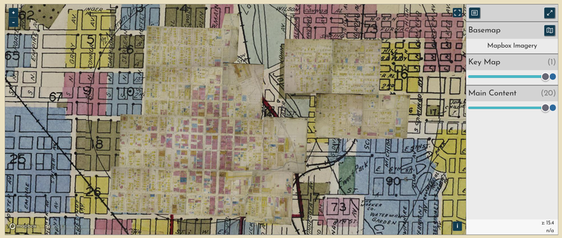 In this example from Joplin, Mo., a handful of layers have been georeferenced, including the "key map" which is displayed underneath the main content of the atlas. As more layers are created, they will slowly obscure the corresponding locations on the key map, giving a clear visual indicator of completion.